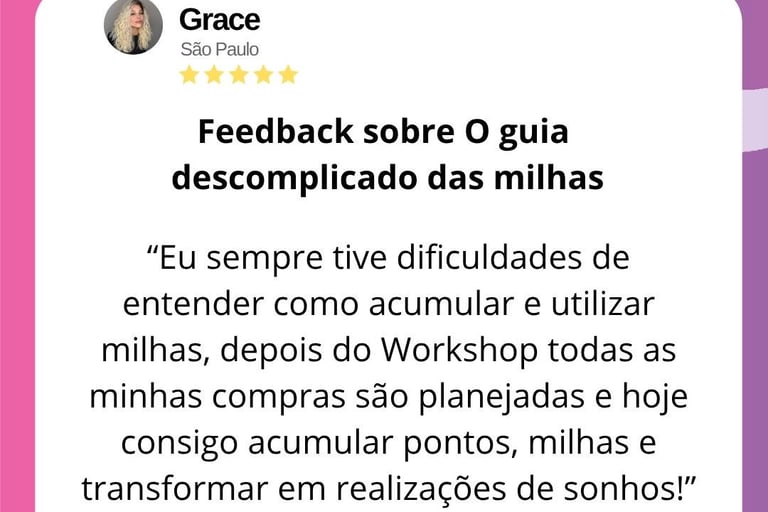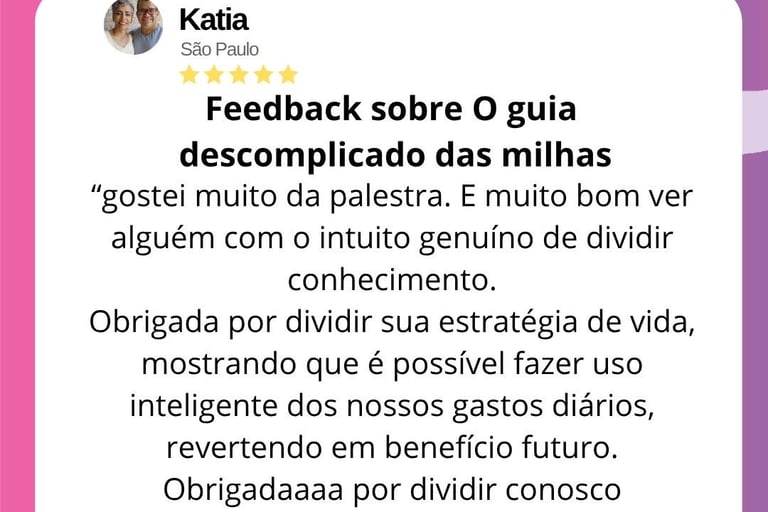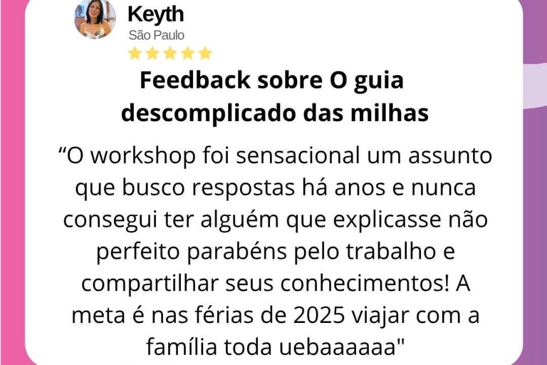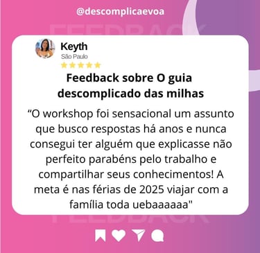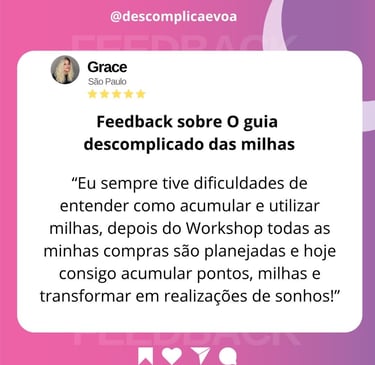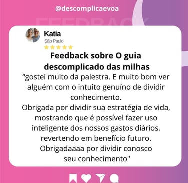 Essa paixão me levou a criar o @descomplicaevoa em 2023 no qual eu compartilho minhas viagens e falo sobre educação financeira. O entusiasmo dos meus seguidores e mentorados me motivou a desenvolver o GUIA DESCOMPLICADO DAS MILHAS: o método que te fará voar mais, gastando menos.